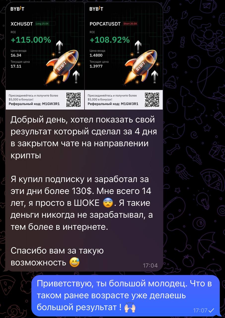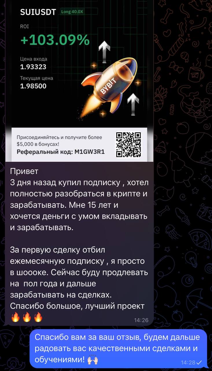 3 дня назад приобрел подписку, хотел посвятить себя полноценному заработку на криптовалюте. Зашел в первые сделки, которые предоставил эксперт Кирилл и за первую сделку отбил подписку! Спасибо большое за такую возможность!